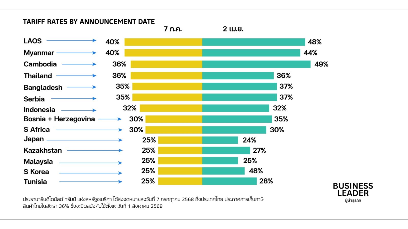 ตั้งแต่วันที่ 1 สิงหาคม 2568 สหรัฐอเมริกาจะเก็บภาษีไทยในอัตรา 36% สำหรับสินค้าไทยทุกประเภทที่ส่งเข้าสหรัฐฯ นอกเหนือจากภาษีตามประเภทสินค้าที่มีอยู่แล้ว สินค้าที่ขนส่งผ่านประเทศอื่นเพื่อหลีกเลี่ยงภาษีที่สูงกว่าจะต้องเสียภาษีในอัตราที่สูงกว่านั้น ประธานาธิบดีทรัมป์ย้ำว่าตัวเลข 36% นี้ยังน้อยกว่าสิ่งที่จำเป็นในการขจัดความแตกต่างของดุลการค้าขาดดุลที่สหรัฐฯ มีกับไทย