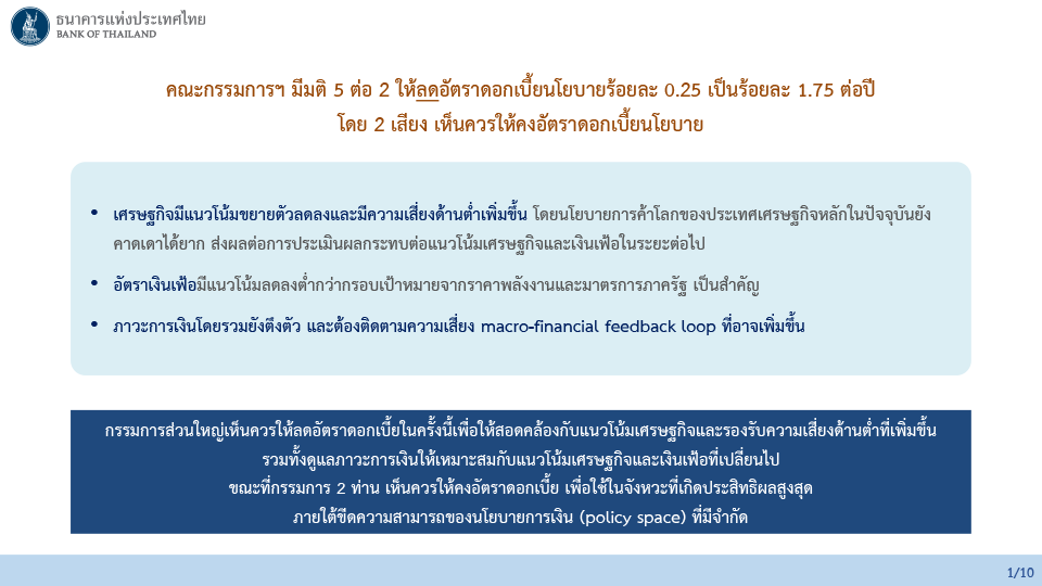 เศรษฐกิจไทยมีแนวโน้มปรับลดลงและมีความเสี่ยงด้านต่ำเพิ่มขึ้นจากนโยบายการค้าโลกและจำนวนนักท่องเที่ยวต่างชาติที่ลดลง อัตราเงินเฟ้อทั่วไปมีแนวโน้มลดลงต่ำกว่ากรอบเป้าหมายจากปัจจัยด้านอุปทานเป็นสำคัญ ด้านภาวะการเงินโดยรวมยังตึงตัว กรรมการส่วนใหญ่จึงเห็นควรให้ปรับลดอัตราดอกเบี้ยนโยบายลงร้อยละ 0.25 ในการประชุมครั้งนี้ เพื่อให้สอดคล้องกับแนวโน้มเศรษฐกิจและรองรับความเสี่ยงด้านต่ำที่เพิ่มขึ้น รวมทั้งดูแลภาวะการเงินให้เหมาะสมกับแนวโน้มเศรษฐกิจและเงินเฟ้อที่เปลี่ยนไป ขณะที่กรรมการ 2 ท่านเห็นควรให้คงอัตราดอกเบี้ยนโยบาย เพื่อใช้ในจังหวะที่เกิดประสิทธิผลสูงสุดภายใต้ขีดความสามารถของนโยบายการเงิน (policy space) ที่มีจำกัด