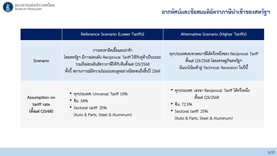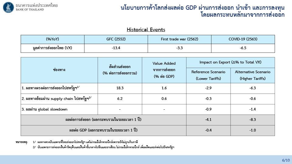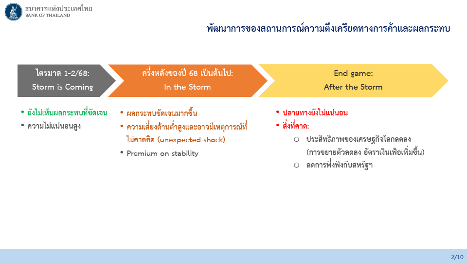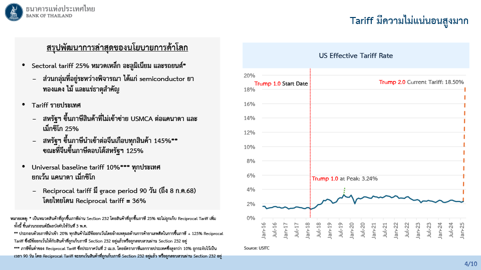 สถานการณ์นโยบายการค้าสหรัฐฯ และการตอบโต้ของประเทศเศรษฐกิจหลักจะนำไปสู่การปรับเปลี่ยนภูมิทัศน์ทางเศรษฐกิจ การเงิน และการค้าโลกอย่างมีนัย โดยในปัจจุบันยังอยู่ในระยะเริ่มต้นที่ความไม่แน่นอนสูงมาก เศรษฐกิจโลกมีแนวโน้มปรับลดลง สถานการณ์มีแนวโน้มยืดเยื้อและผลกระทบจะทอดยาวไปสู่การเปลี่ยนแปลงโครงสร้างการค้าการผลิตโลกที่ทำให้ประสิทธิภาพลดลงในระยะยาว ทั้งนี้ นโยบายการค้าโลกของประเทศเศรษฐกิจหลักในอนาคตยังคาดเดาได้ยาก ส่งผลต่อการประเมินแนวโน้มเศรษฐกิจและเงินเฟ้อในระยะต่อไป