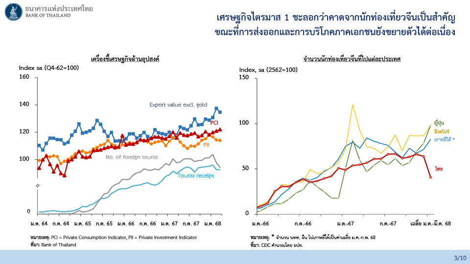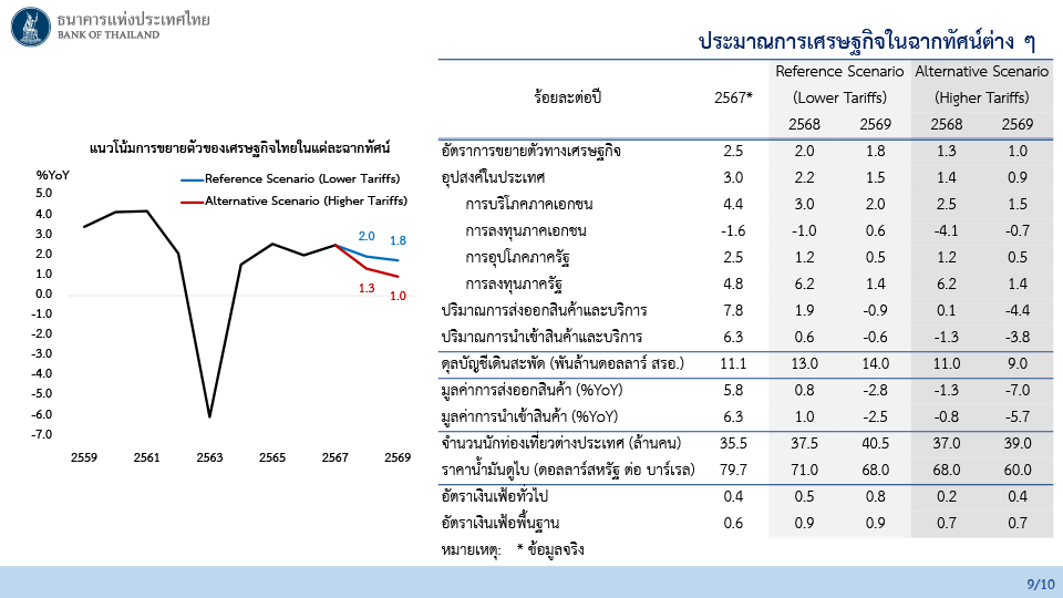 เศรษฐกิจไทยมีแนวโน้มขยายตัวลดลงและมีความเสี่ยงด้านต่ำเพิ่มขึ้นจากนโยบายการค้าโลก และจำนวนนักท่องเที่ยวต่างชาติ มองไปข้างหน้า นโยบายการค้าจะเริ่มส่งผลกระทบมากขึ้นตั้งแต่ช่วงครึ่งหลังของปี 2568 อย่างไรก็ดี ความไม่แน่นอนยังสูงมาก คณะกรรมการฯ จึงประเมินภาพเศรษฐกิจภายใต้หลายฉากทัศน์ ตัวอย่างเช่น ฉากทัศน์ที่การเจรจาทางการค้ามีความยืดเยื้อและภาษีนำเข้าของสหรัฐฯ ใกล้เคียงกับอัตราปัจจุบัน (reference scenario) อาจส่งผลให้เศรษฐกิจไทยในปี 2568 ขยายตัวประมาณร้อยละ 2.0 และฉากทัศน์ที่สงครามการค้ารุนแรงมากและภาษีนำเข้าของสหรัฐฯ อยู่ในอัตราที่สูง (alternative scenario) อาจทำให้เศรษฐกิจไทยในปี 2568 ขยายตัวประมาณร้อยละ 1.3 ทั้งนี้ สิ่งที่เกิดจริงจะขึ้นอยู่กับนโยบายและการปรับตัวของประเทศต่างๆ จึงต้องติดตามพัฒนาการการค้าโลกและผลกระทบต่อเศรษฐกิจไทยอย่างใกล้ชิด การแก้ปัญหาและลดผลกระทบจากนโยบายการค้าข้างต้นจำเป็นต้องผสมผสานนโยบายหลายด้านเสริมกัน เพื่อเพิ่มขีดความสามารถในการแข่งขันให้กับภาคธุรกิจ