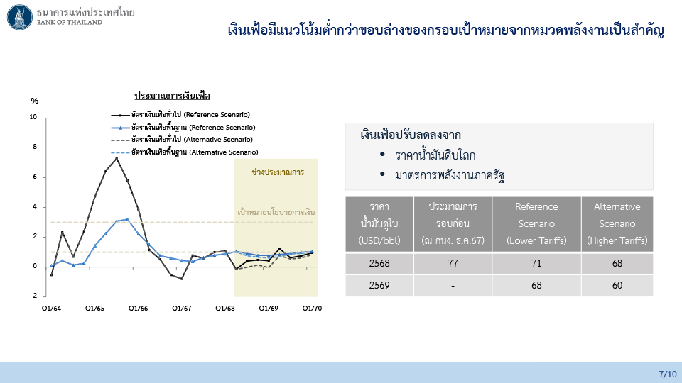 อัตราเงินเฟ้อทั่วไปมีแนวโน้มลดลงต่ำกว่ากรอบเป้าหมายจากราคาน้ำมันดิบโลกและมาตรการภาครัฐ ซึ่งมีส่วนช่วยบรรเทาค่าครองชีพและลดต้นทุนของภาคธุรกิจ ขณะที่อัตราเงินเฟ้อพื้นฐานมีแนวโน้มทรงตัวและเงินเฟ้อคาดการณ์ในระยะปานกลางยังยึดเหนี่ยวอยู่ในกรอบเป้าหมาย ทั้งนี้ นโยบายกีดกันทางการค้าและการเปลี่ยนแปลงห่วงโซ่การผลิตโลกอาจส่งผลต่อแนวโน้มเงินเฟ้อในระยะข้างหน้า