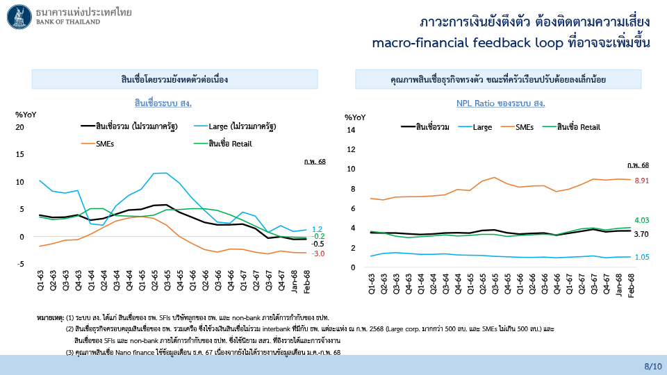 ภาวะการเงินยังตึงตัว สินเชื่อรวมหดตัวเล็กน้อย และคุณภาพสินเชื่อยังปรับด้อยลงโดยเฉพาะสินเชื่อที่อยู่อาศัยและสินเชื่อธุรกิจในกลุ่มที่เผชิญปัญหาเชิงโครงสร้าง นอกจากนี้ นโยบายการค้าโลกอาจสร้างแรงกดดันเพิ่มเติมต่อฐานะการเงินของภาคธุรกิจและครัวเรือน จึงต้องติดตามนัยต่อกิจกรรมทางเศรษฐกิจและภาคการเงินที่มีความเชื่อมโยงกัน