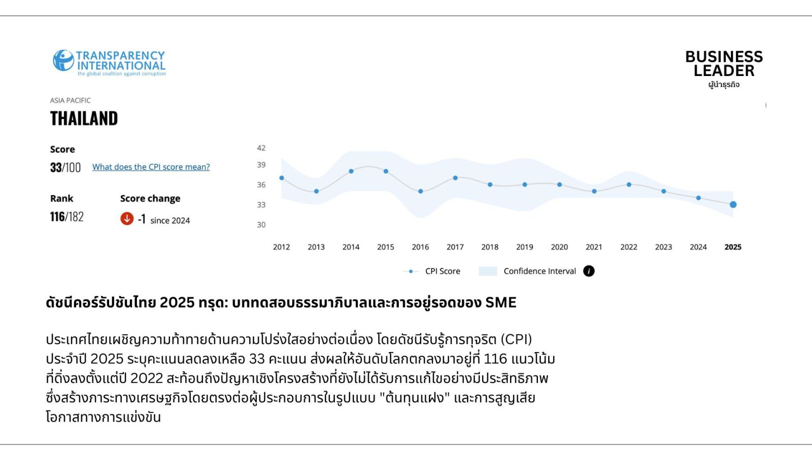 การประกาศผลดัชนีภาพลักษณ์คอร์รัปชัน (Corruption Perceptions Index: CPI) ประจำปี 2025 โดย Transparency International เมื่อวันที่ 10 กุมภาพันธ์ 2026 ไม่ได้เป็นเพียงการรายงานตัวเลขประจำปี หากแต่เป็นสัญญาณเตือนเชิงโครงสร้างที่สะท้อนความเปราะบางของระบบธรรมาภิบาลไทยในสายตานานาชาติอย่างชัดเจนที่สุดในรอบเกือบสองทศวรรษ